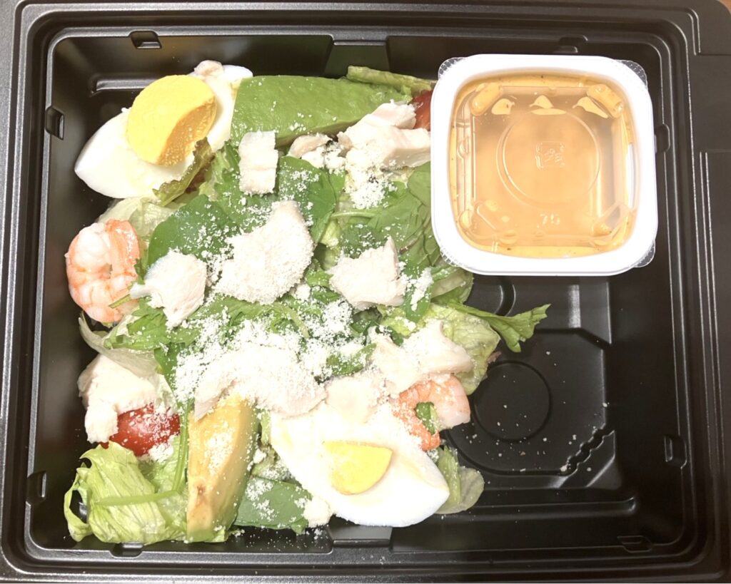昼はデニーズのテイクアウトで「とろ~り卵とチーズのオムライス」(684kcal P27.6g F33.2g C66.1g)と「COBBサラダ」(202kcal P8.6g F16.0g C6.4g)を注文しました。