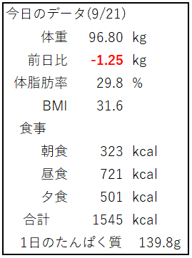 結果として1日の合計は1545kcal、たんぱく質139.8gとかなり充実した内容になりました。