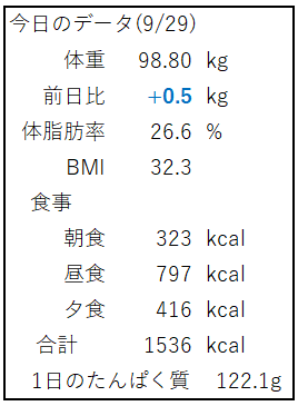ただし、体脂肪率は26.6%といつもより3%以上低下しており、この体重増加の大半が水分によるむくみだと考えられるため、焦りはありません。