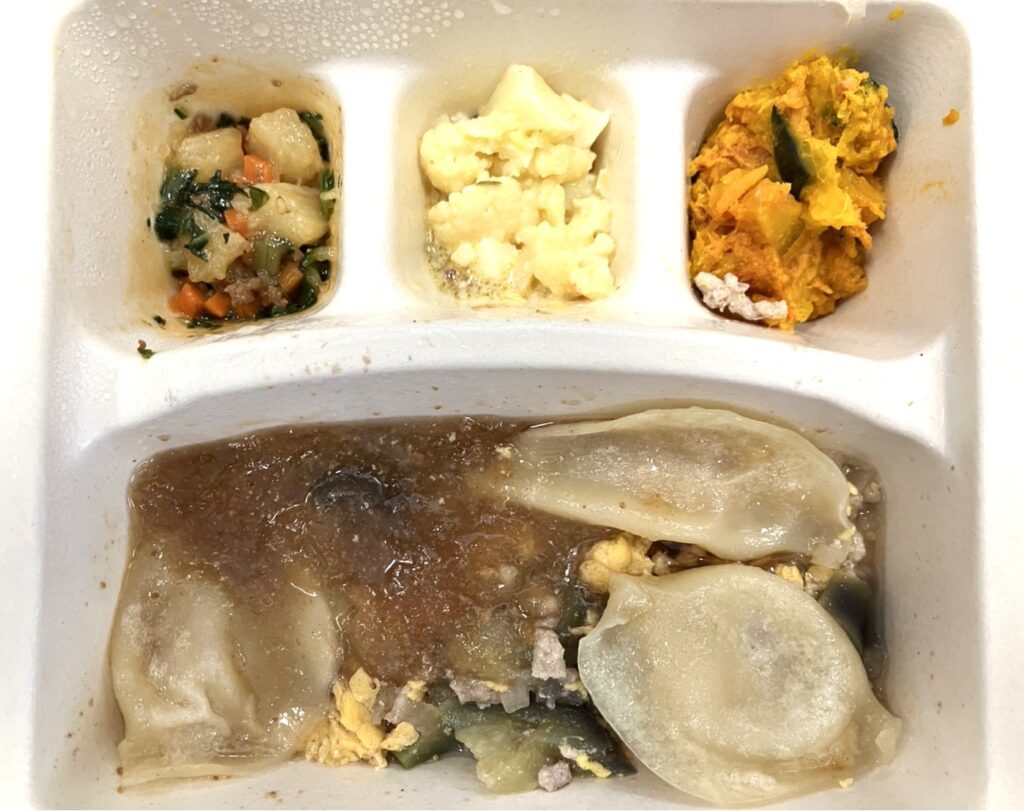 水餃子は少なめの3個で、たれの野菜や炒り卵、そぼろがボリュームの大半を占める構成でした。
