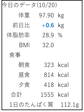 本日の体重は97.9kg・体脂肪率28.9%でした。
