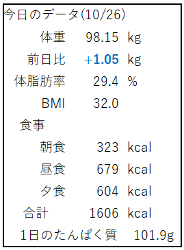本日の体重は98.15kg・体脂肪率29.4%でした。