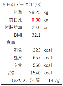 本日の体重は98.25kg(前日比 -0.3kg)