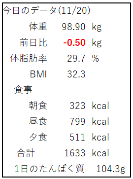 1日の総摂取カロリーは1633kcal、脂質は49.1gに抑え、たんぱく質は104.3gを確保できたので十分だと思います。