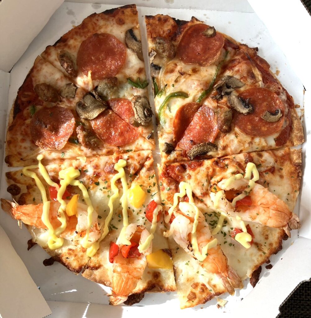 妻は新作のダンシングレモンマヨシュリンプとドミノデラックスのハーフ&ハーフを注文していたので参考に写真を載せておきます!