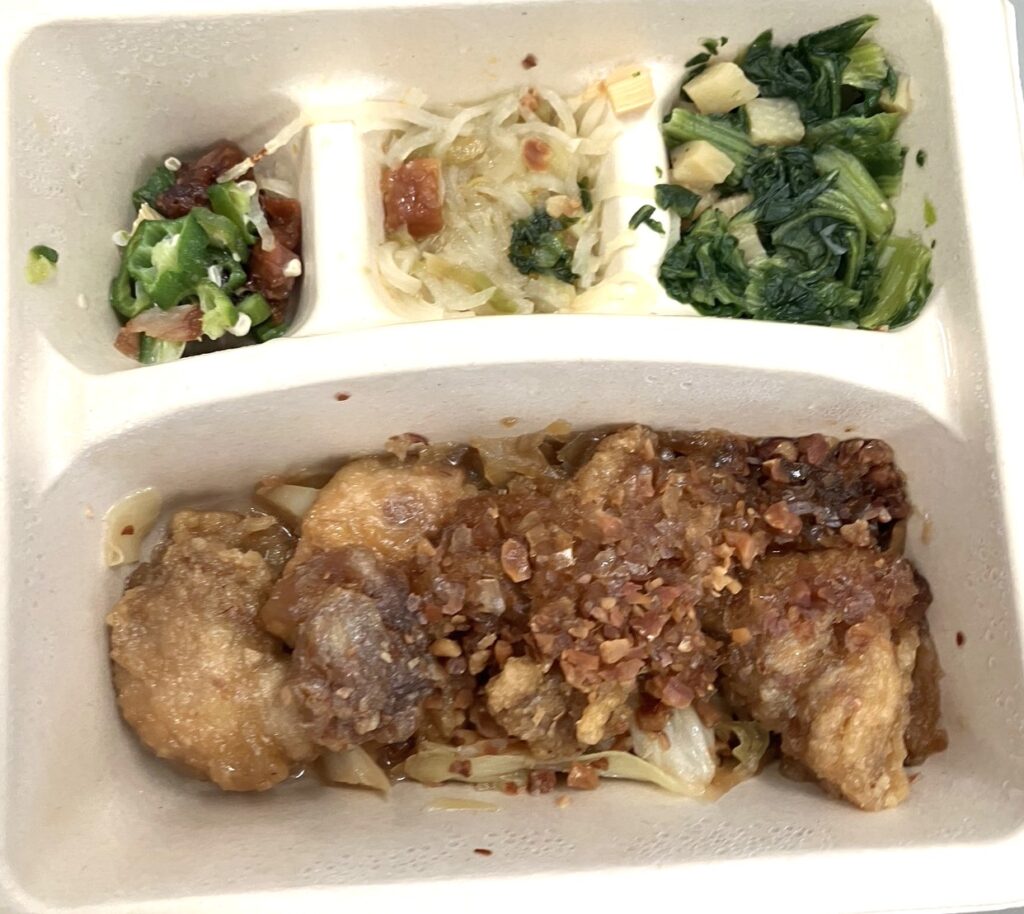 今日の昼は nosh の油淋鶏(384kcal/P23.4g/F22.0g/C26.0g)。