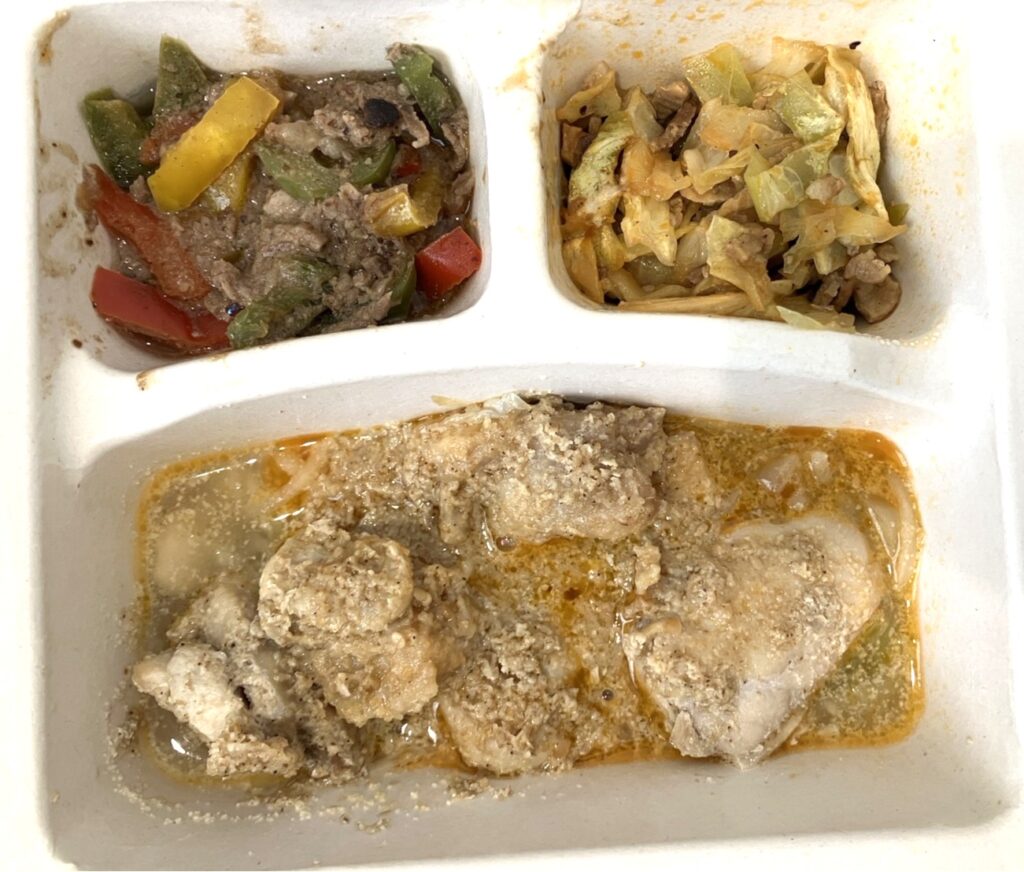 メインは鶏肉ににんにくを効かせたごまソースで非常に美味しく、副菜も牛肉ピーマンとミニ回鍋肉と肉中心の構成。鶏・牛・豚が入っているため「肉三昧」という名前の通りの内容でした。