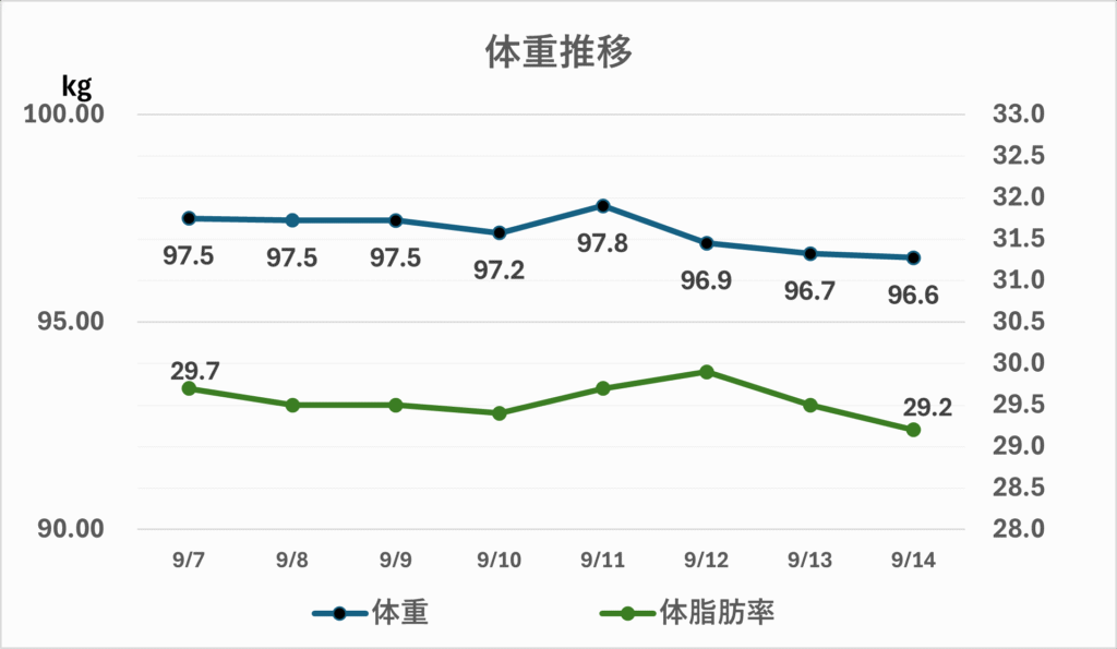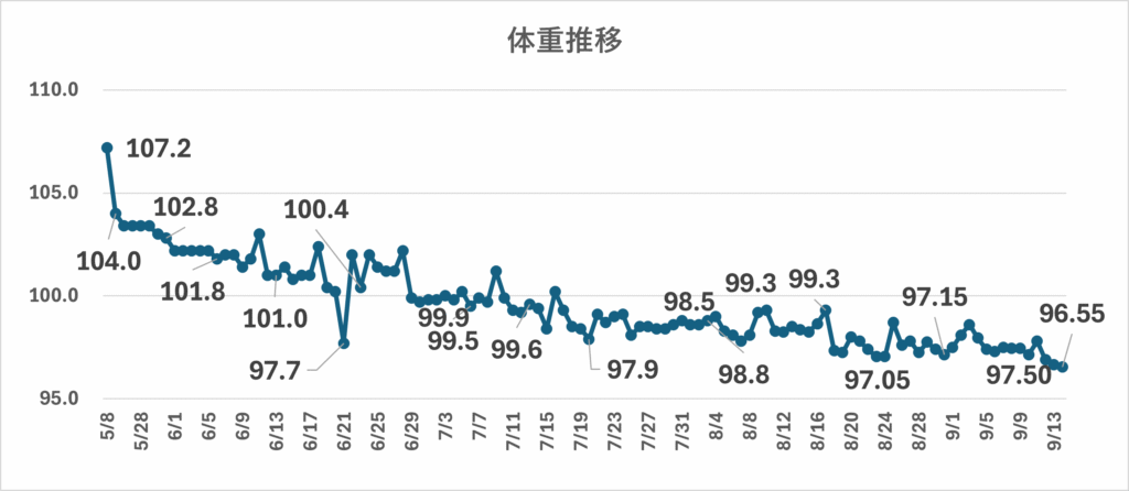 - 全体としては序盤の107kg台から、ついに96kg台まで到達しました。