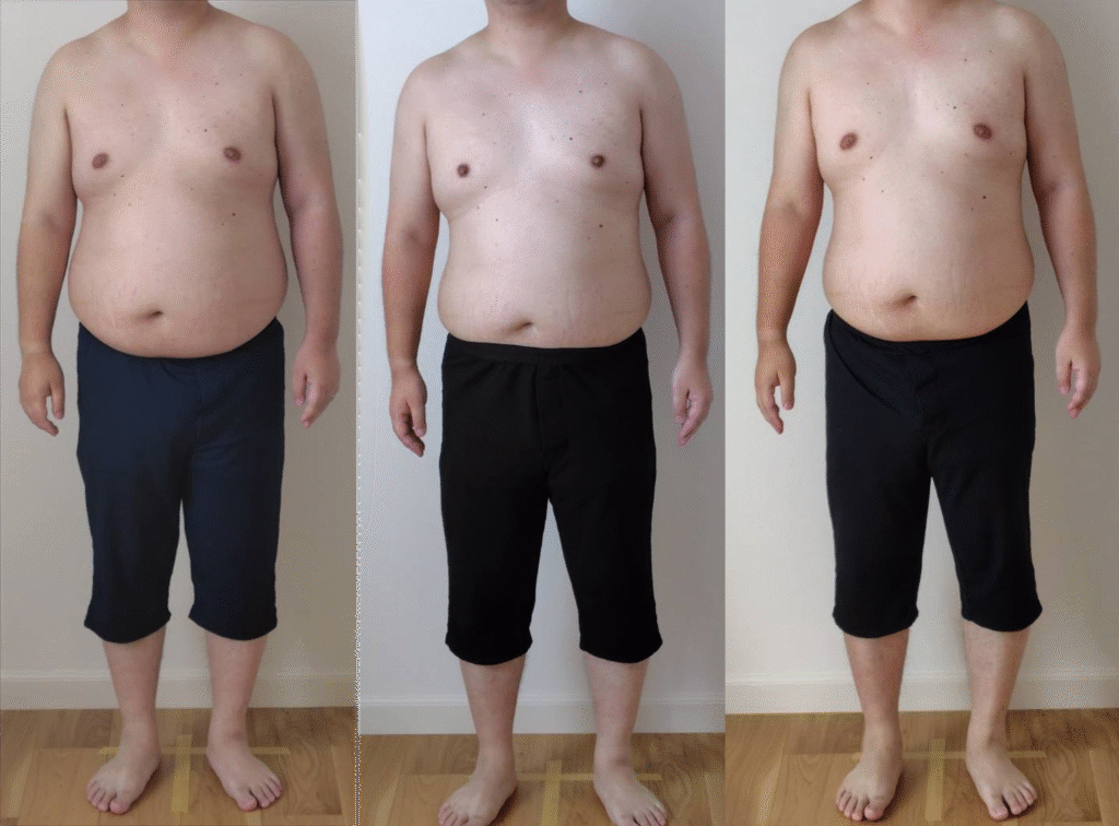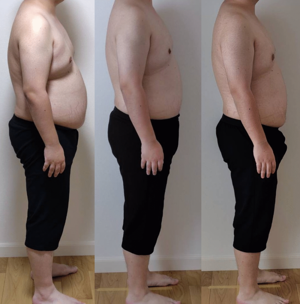 正面・側面ともに、お腹まわりの厚みが少しずつ減っているのが確認できます。